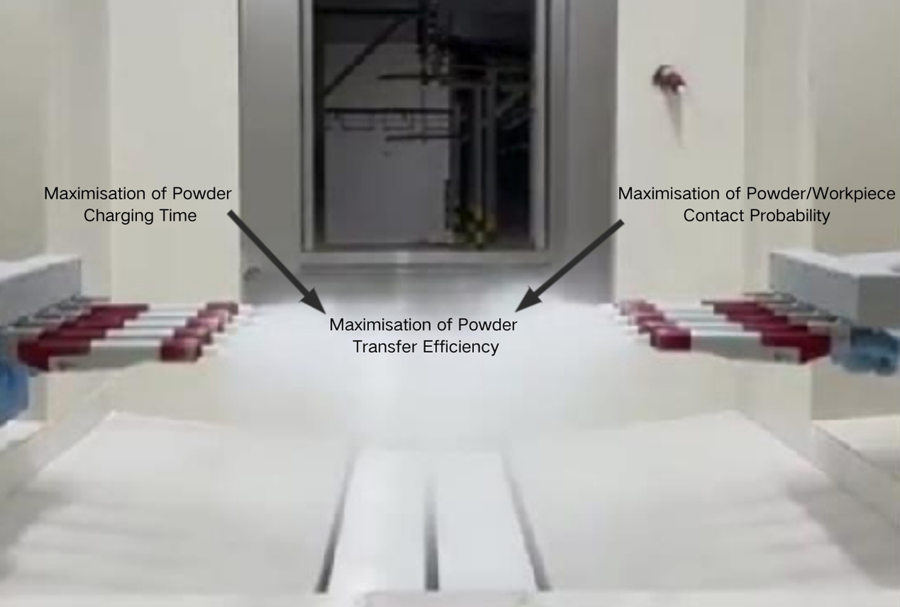This novel concept is to create a powder cloud in the middle of the spray booth which forms into a vortex, such that the powder particles are suspended in this area for a prolong period. The benefits are that, not only